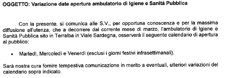 L'Asl di Oristano ha comunicato la variazione delle date dell'ambulatorio di igiene e sanità pubblica, sito in Terralba in Viale Sardegna, a decorrere dal mese di Marzo 2026.